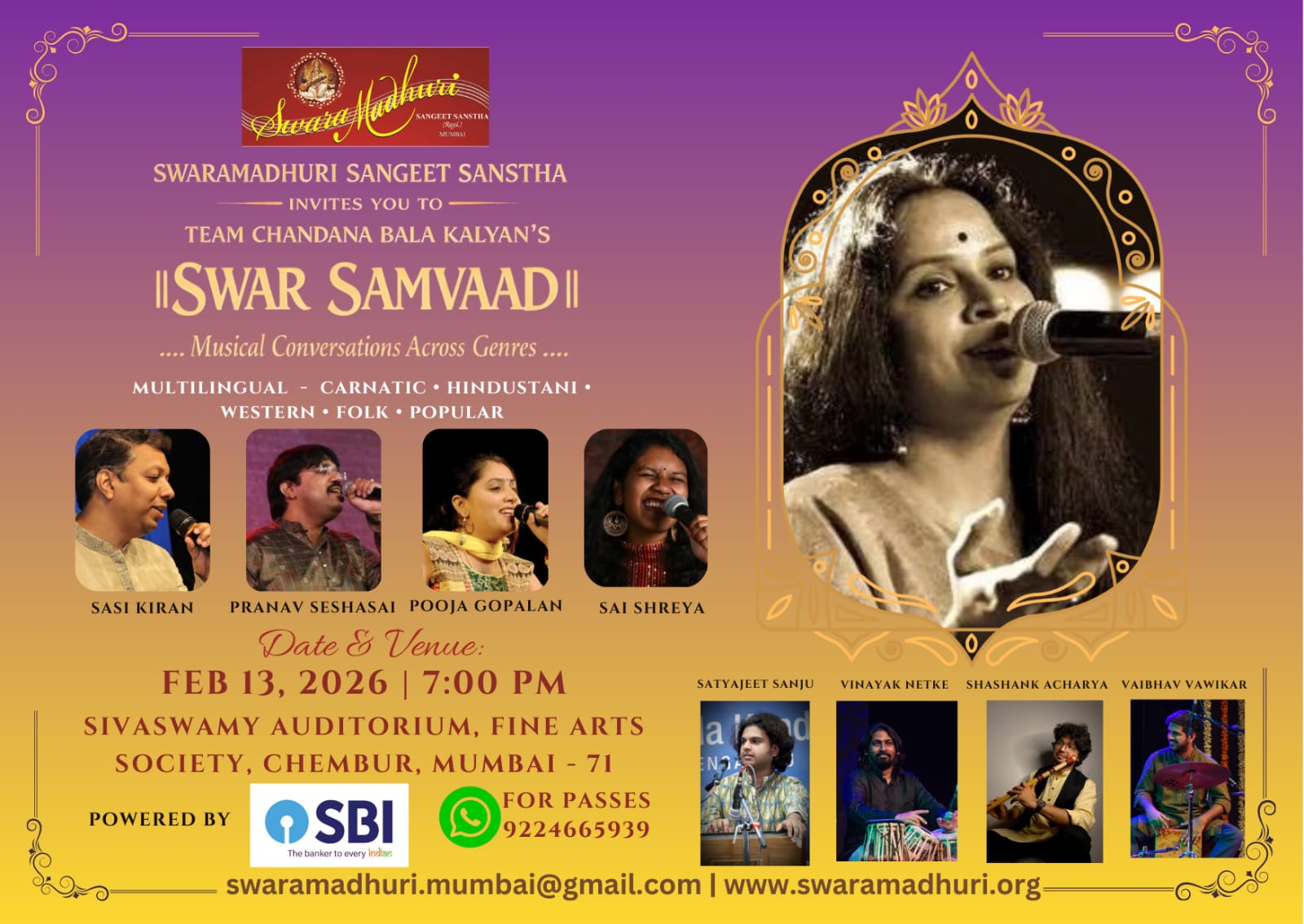 Swaramadhuri Sangeet Sanstha (SSS) is a Mumbai-based non-profit organization founded by Mrs. Dwibhashyam Girija in 2009, with the primary objective of nurturing and promoting musical talent in and around Mumbai. Till date, SSS has successfully performed more than 100 stage shows in genres ranging from Carnatic Classical, Hindustani, Telugu and Hindi film songs in Mumbai, Navi Mumbai, Thane, Shirdi and Pune in India and Shanghai, China.